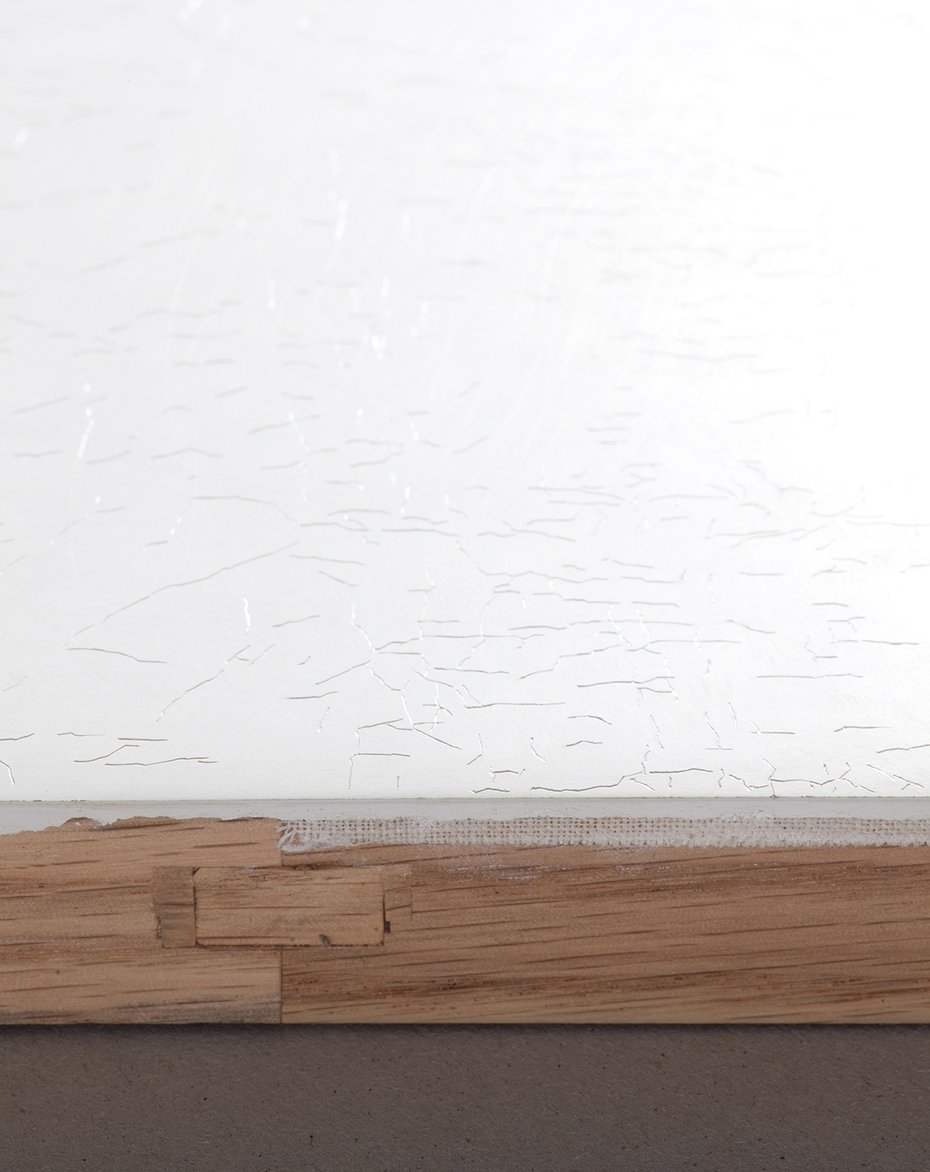Over time old paintings develop cracks in the painted surface. The shape of these cracks depends on the material of the ground and the conditions the painting has been exposed to. Using a beamer projection I copied the subtle network of cracks (craquelure) onto a primed image carrier which is of the same size and material as the original. The lines were scratched into the priming with a needle. Over time my paintings, too develop cracks, and two states of aging are superimposed onto each other.